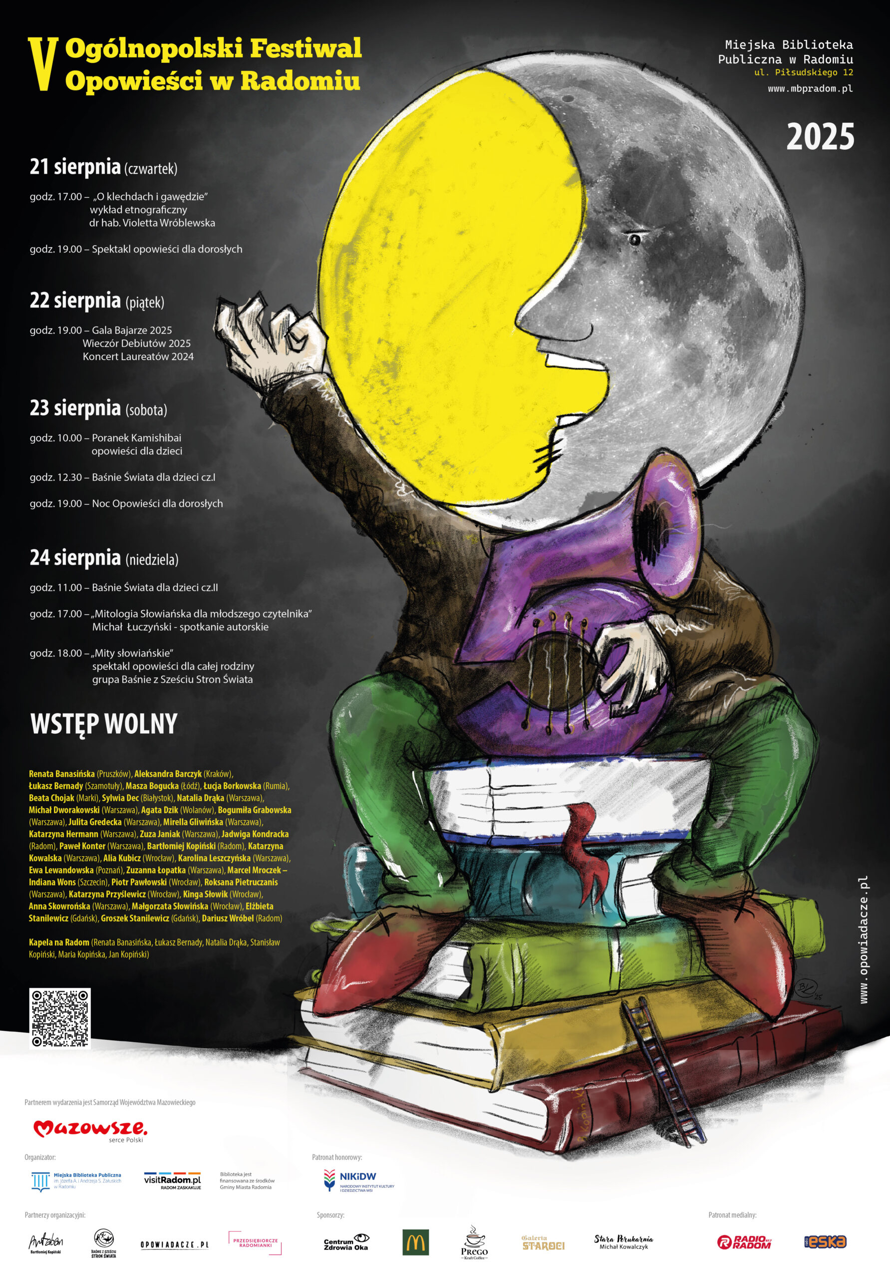 Zapraszamy na już 5. Ogólnopolski Festiwal Opowieści w Radomiu w dniach 21 – 24 sierpnia 2025 r. W tym czasie zjadą do Radomia najlepsi polscy Opowiadacze i Opowiadaczki by snuć swoje opowieści, baśnie i legendy ze wszystkich stron świata. Podczas Festiwalu nie zabraknie także wydarzeń towarzyszących, m.in. przyznamy nagrodę Bajarza 2025 dla osób i instytucji zasłużonych dla polskiej sztuki opowiadania ustnego, wieczór debiutów i koncert laureatów z lat poprzednich. Zaplanowaliśmy także spektakle narracyjne dla widzów w każdym wieku. A to wszystko, już po raz piąty, w gościnnych progach i ogrodzie Miejskiej Biblioteki Publicznej w Radomiu.
